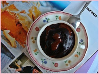 Budyń ma mocno kakaowy smak, wzmocniony obecnością kawałków czekolady.